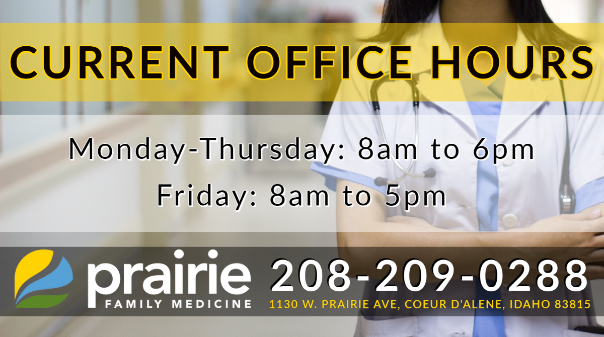 Prairie Family Medicine, PLLC, located in Coeur d'Alene, Idaho, offers a comprehensive personalized approach to all of your medical needs, including family medicine, pediatrics, and adolescent medicine, geriatric care, holistic medicine, hormone therapy, aesthetic services, urgent care, and mental health services. Prairie Family Medicine was voted the BEST Family Physician / Family Practice Clinic in the North Idaho Business Journal, two years in a row. Our clinic is equipped with a full x-ray department, EKG, mobile ultrasound, fully staffed laboratory, and offers same-day urgent care services like stitches, splinting, and casting. This allows us to treat our patients quickly and accurately while providing convenience to our patients. Our office curbside care station is a fully equipped exam room station with a negative pressure set up to ensure safe treatment to all patients We are also a preferred provider, accept most insurances, and are centrally located, on the border of Coeur d'Alene and Hayden, just 15 minutes from the hospital.